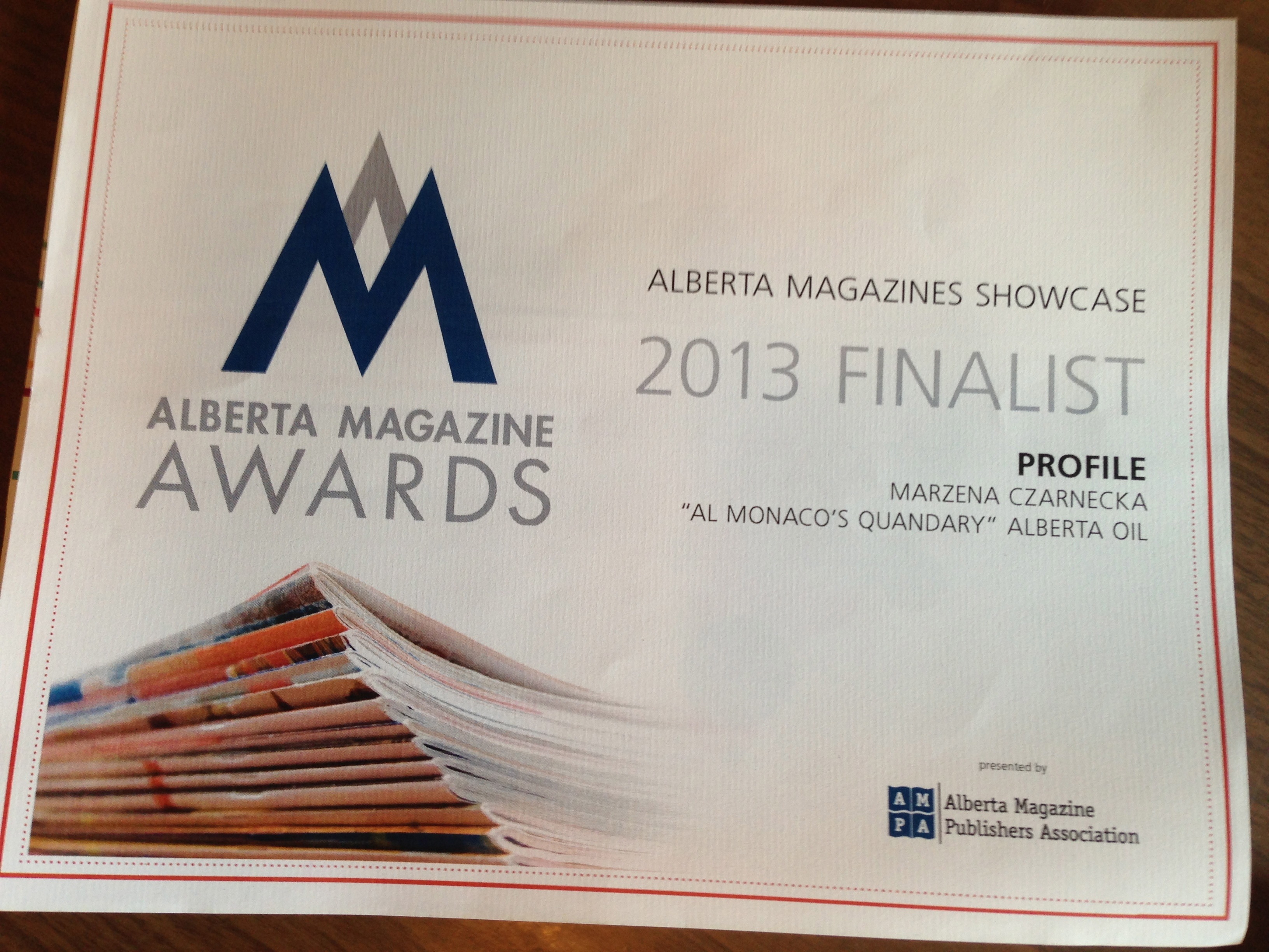 The piece was nominated, shortlisted and received an Honourable Mention at the 2013 Alberta Magazine Awards Showcase, and I got this pretty little thing in the mail: