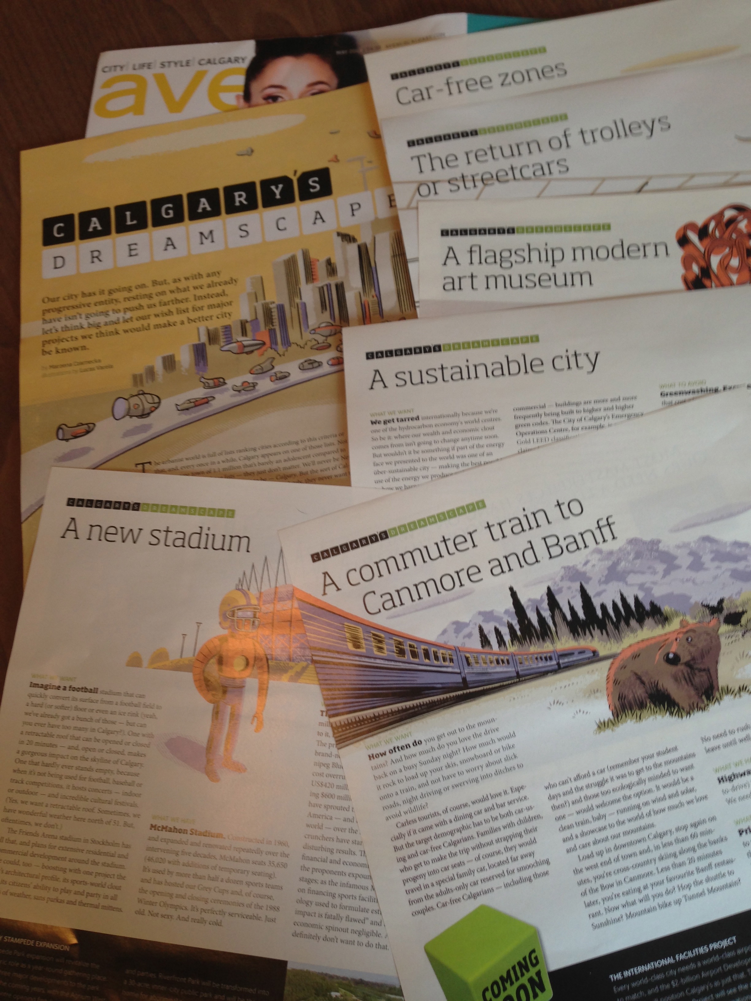 Calgary–we’re so cool, we refer to ourselves by our airport call letters + hashtag half the time–is pretty awesome. But it could be more awesome still. The editors and writers at Avenue magazine riffed for a few weeks on how we could make it more awesome, and then asked me to pull it all together. And I did, in Our Wish List for Calgary (Avenue, May 2013).
