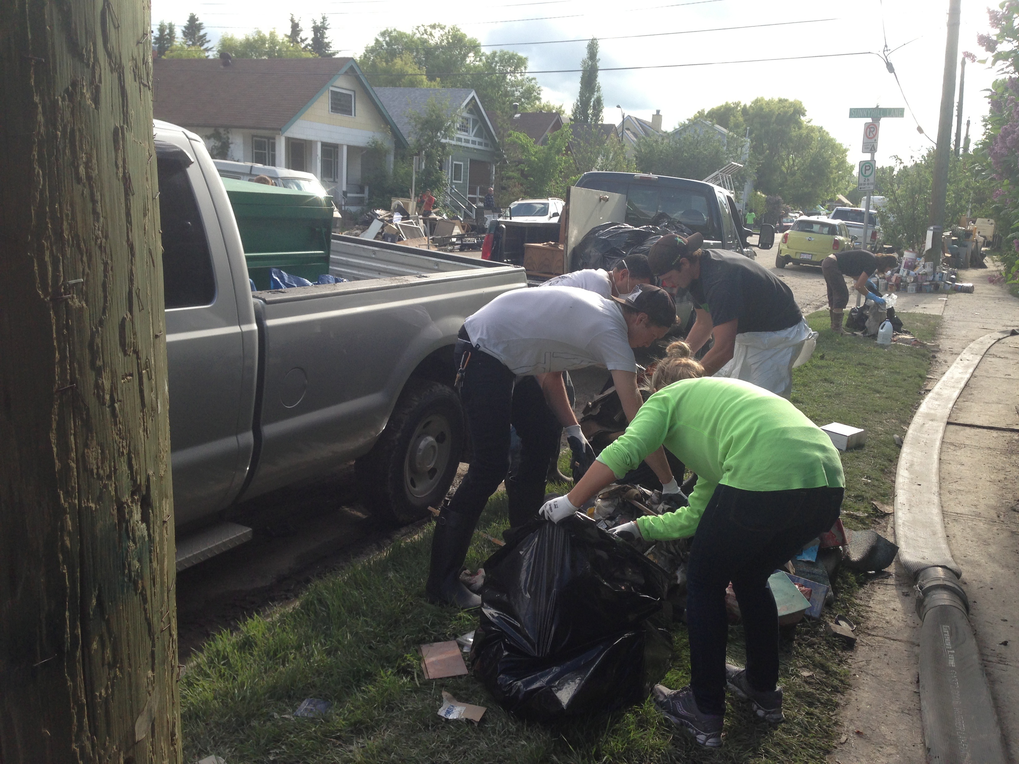 I purposefully chose this very unglamorous photo of volunteers gathering garbage into bags, because–well, clean up, salvage, rip out, what we’re doing–not glamorous, is it? Ugly, dirty work. I’ve never seen people look so happy while gathering garbage. Or feel so good afterwards. If you’re a Calgarian, you know this. That’s why Sunnyhill gutted 38 units in a day.